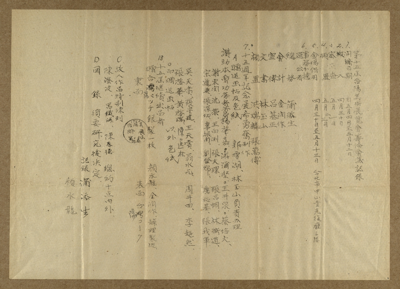 此件為籌備第15屆臺陽展(1952年)的會議記錄,含辦展期程、會場(中山堂光復廳)、展務分工等。為紀念展覽舉辦15週年,提出4點預計項目: