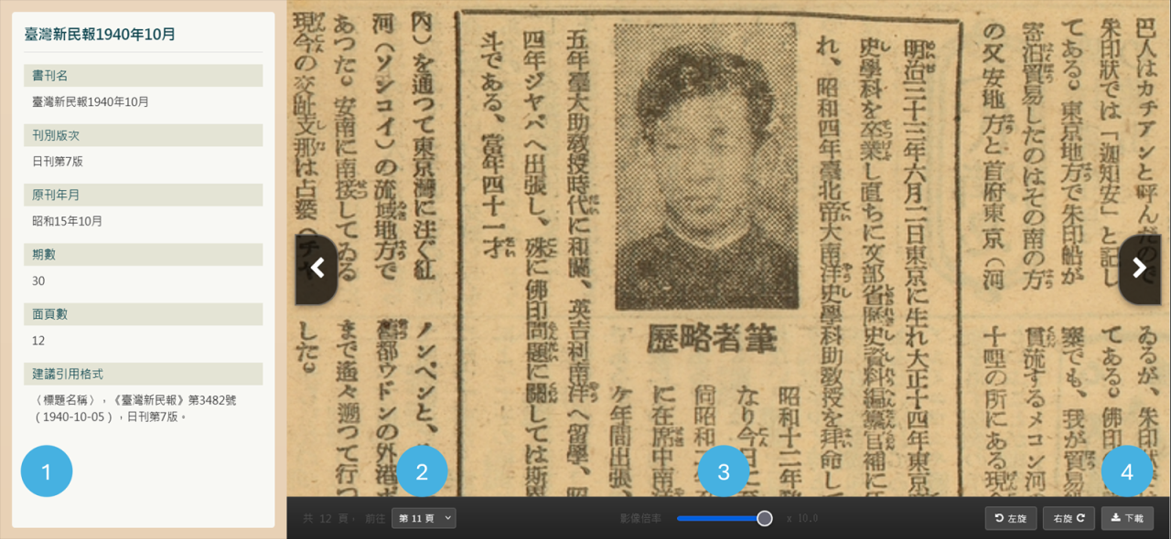 「臺灣文獻全文資料庫」收錄本所典藏戰前日刊報紙史料之新聞標題、數位影像及專題全文,包含《臺灣新民報》系列報刊1932年4月至1944年3月,約2萬多版;《臺灣新聞》1938年1月至1944年3月,1.9萬版,總計3.9萬版。 此次全面更新資料庫之影像瀏覽器介面,改善報紙影像閱覽的縮放功能,可用更高倍率放大檢視內容;同時顯示出處資訊,無需切換頁面;並新增列印/下載功能,可列印或下載附帶目錄資料的PDF檔案。歡迎各界連線使用!